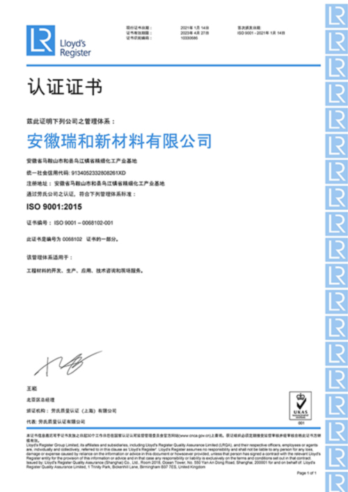 2021年1月14日,安徽瑞和新材料有限公司获得劳氏质量认证(上海)有限公司颁发的ISO9001质量管理体系认证证书,认证范围为工程材料的开发、生产、应用、技术咨询和现场服务。 2021年1月5日~8日,劳氏审核专家组对公司综合办公室、安环工程部、设备部、生产部、工程技术中心进行了全过程、全条款覆盖式现场审核,经过专家全面、严格、细致的指导和审核,确认公司质量管理体系符合ISO 9001:2015质量体系标准的要求,通过现场认证。 ISO9001质量管理体系认证的取得,标志着瑞和公司已步入规范化、标准化、科学化的现代企业管理轨道。瑞和公司将在今后的工作中严格执行质量管理体系及规章制度,进一步优化和规范各项管理制度,不断提高管理水平,持续提升产品质量,更好地为客户提供优质的产品和服务! |